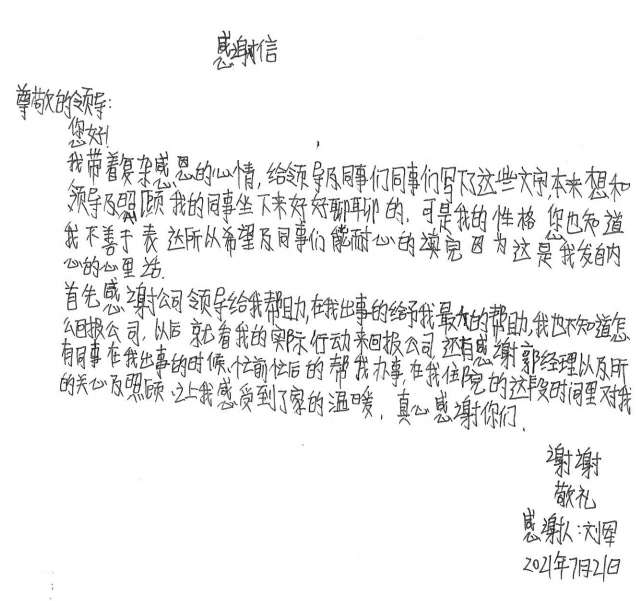 经过半个月治疗休养,刘军手部已无大碍。出院后的他写了一封感谢信并为公司送了一面锦旗,他说道,是南宫体育平台官方网站-南宫(中国)这个大家庭让他感受到了关怀和温暖,他表示要把这种关怀变成工作上的动力,争取早日返回工作岗位,努力工作,回报大家的关心和关爱。